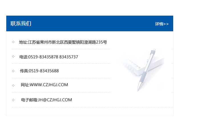 地址:常州市新北區友邦商務大廈1幢16、17層  電話:0519-85101652  傳真:0519-85112595  郵編:213022  網址:www_cz-jiayue_cn.hk-ger.com  郵箱:xiajifengaa@163.com